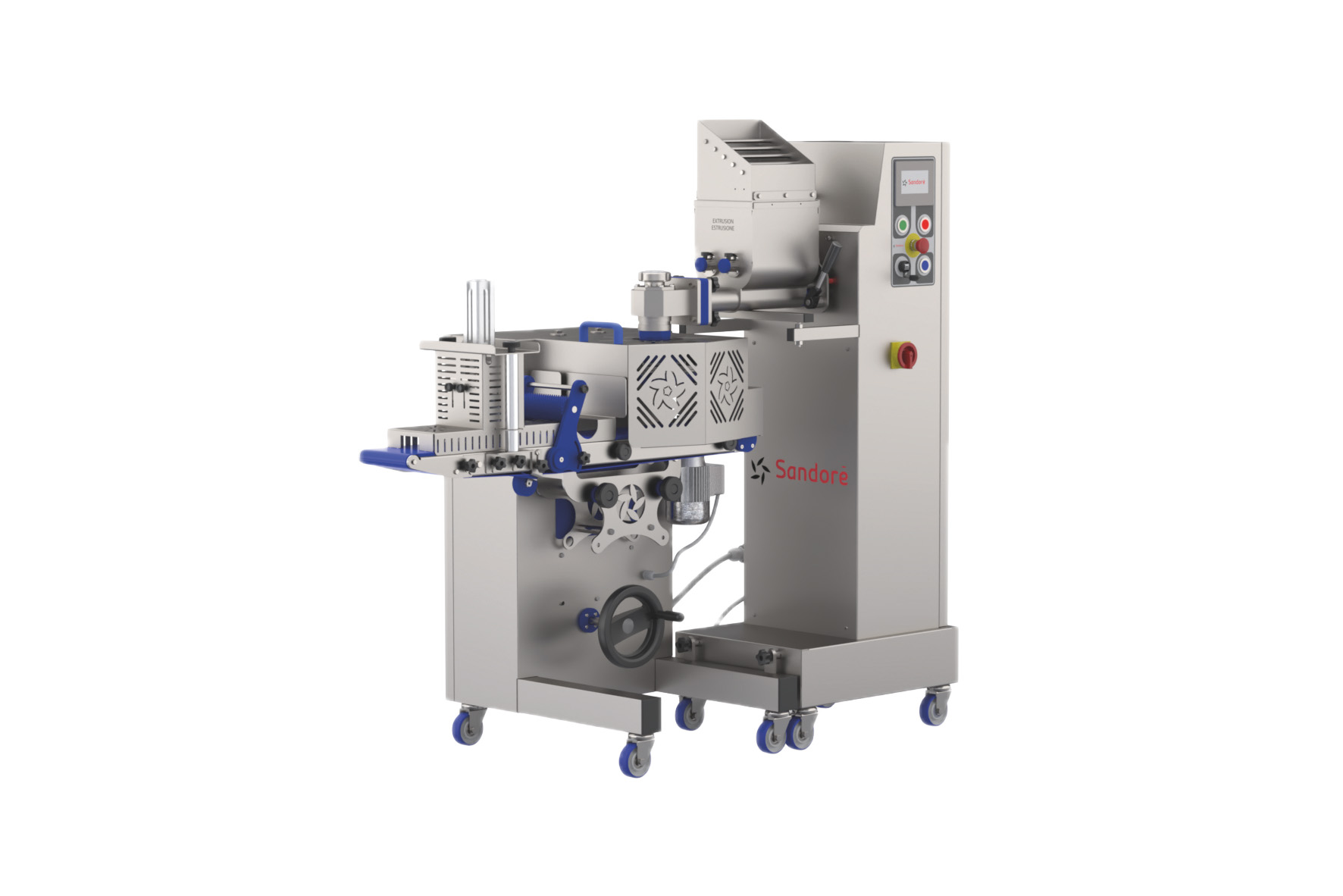 Extruder machine for spherical or bar shape products, entirely made of stainless steel with a supporting structure mounted on revolving wheels, dough extrusion tank equipped of mixing arm and double extrusion screw at variable speed, a single outlet extrusion head equipped with a dough forming nozzle. The extruder is combined with the pneumatic/mechanical diaphragm cutting unit and other accessories. All parts in contact with the food are easily removable for a successful washing.